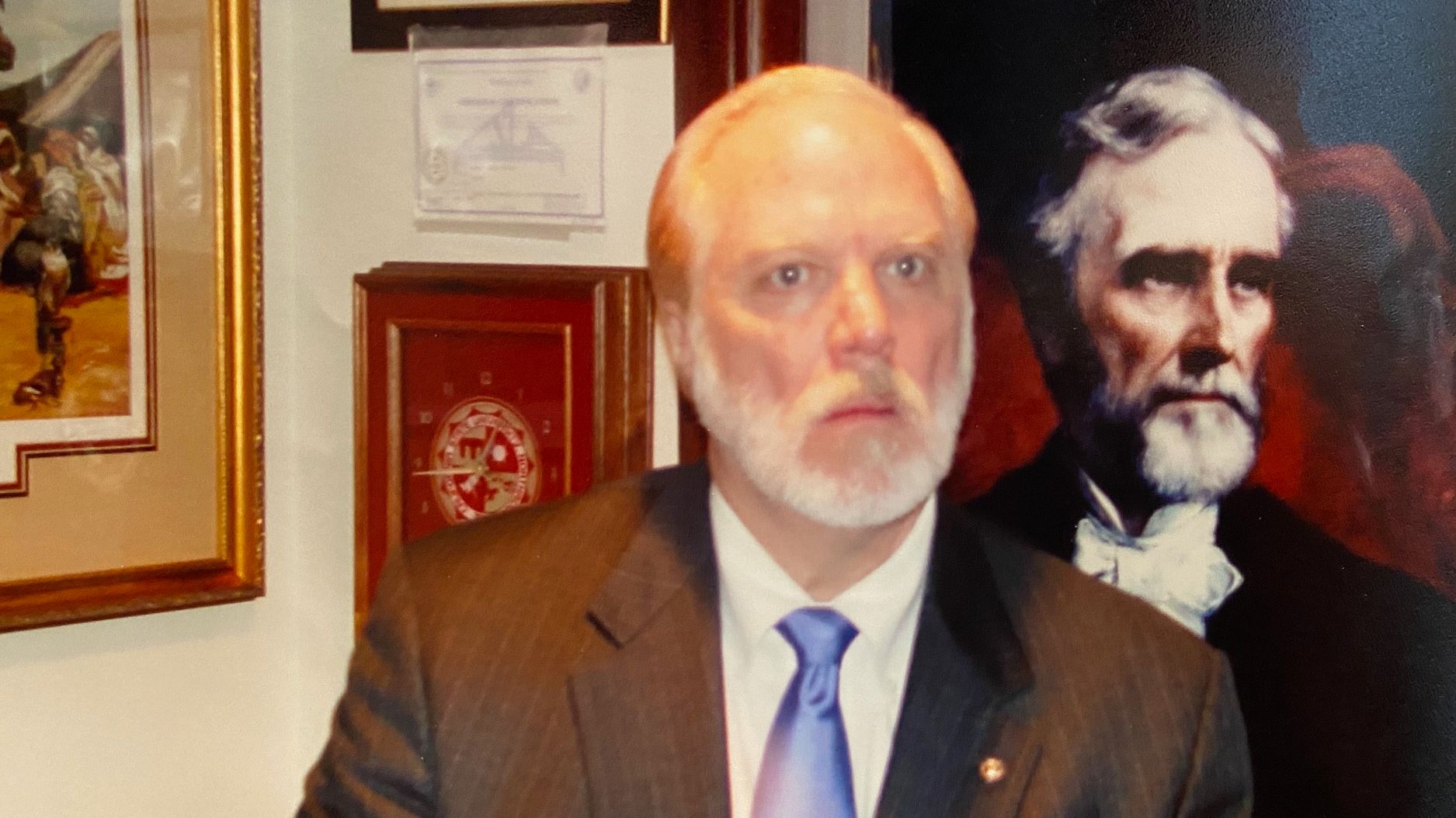 Printed photo of Dr. Haller beside the Jefferson Davis portrait